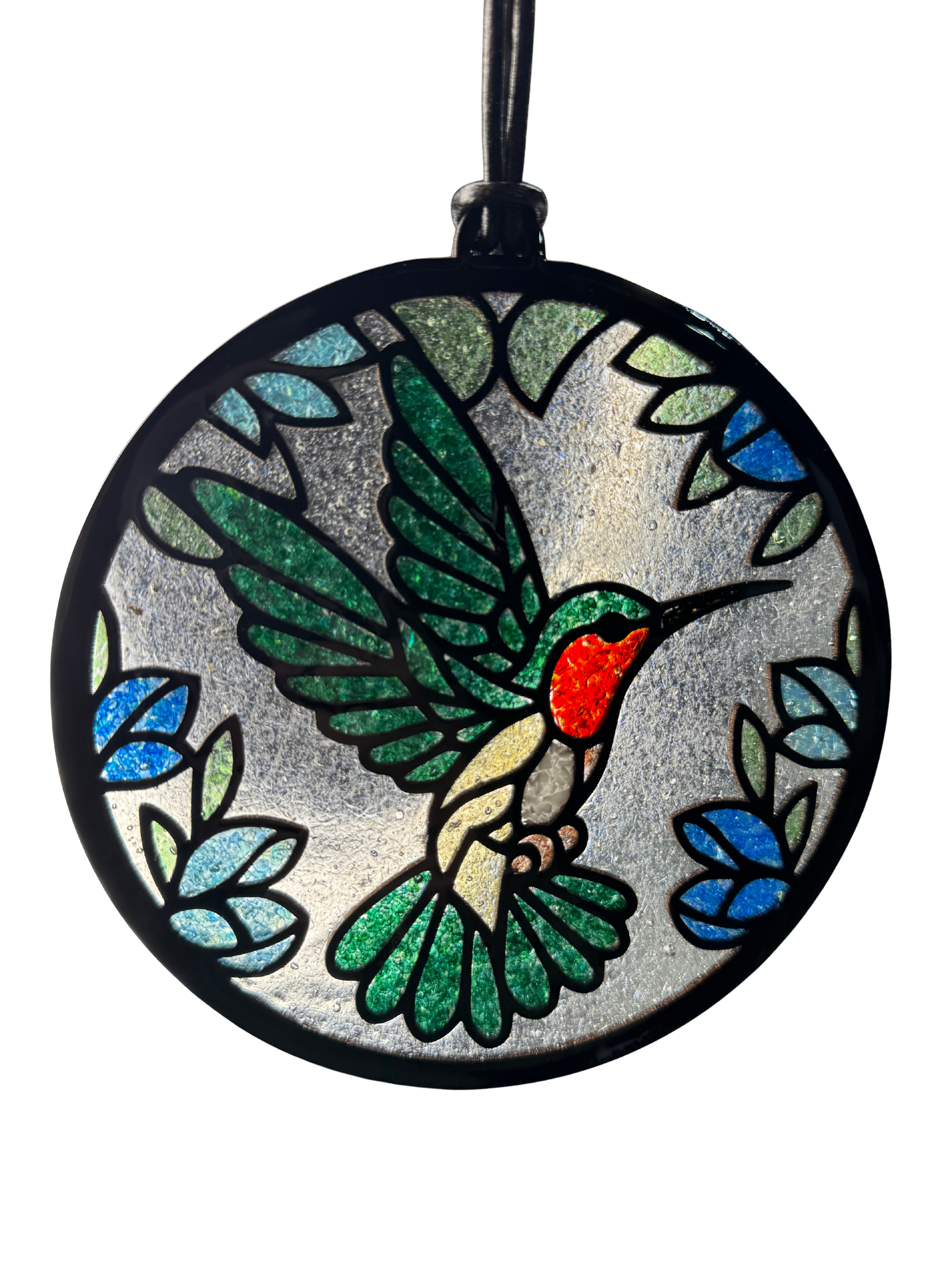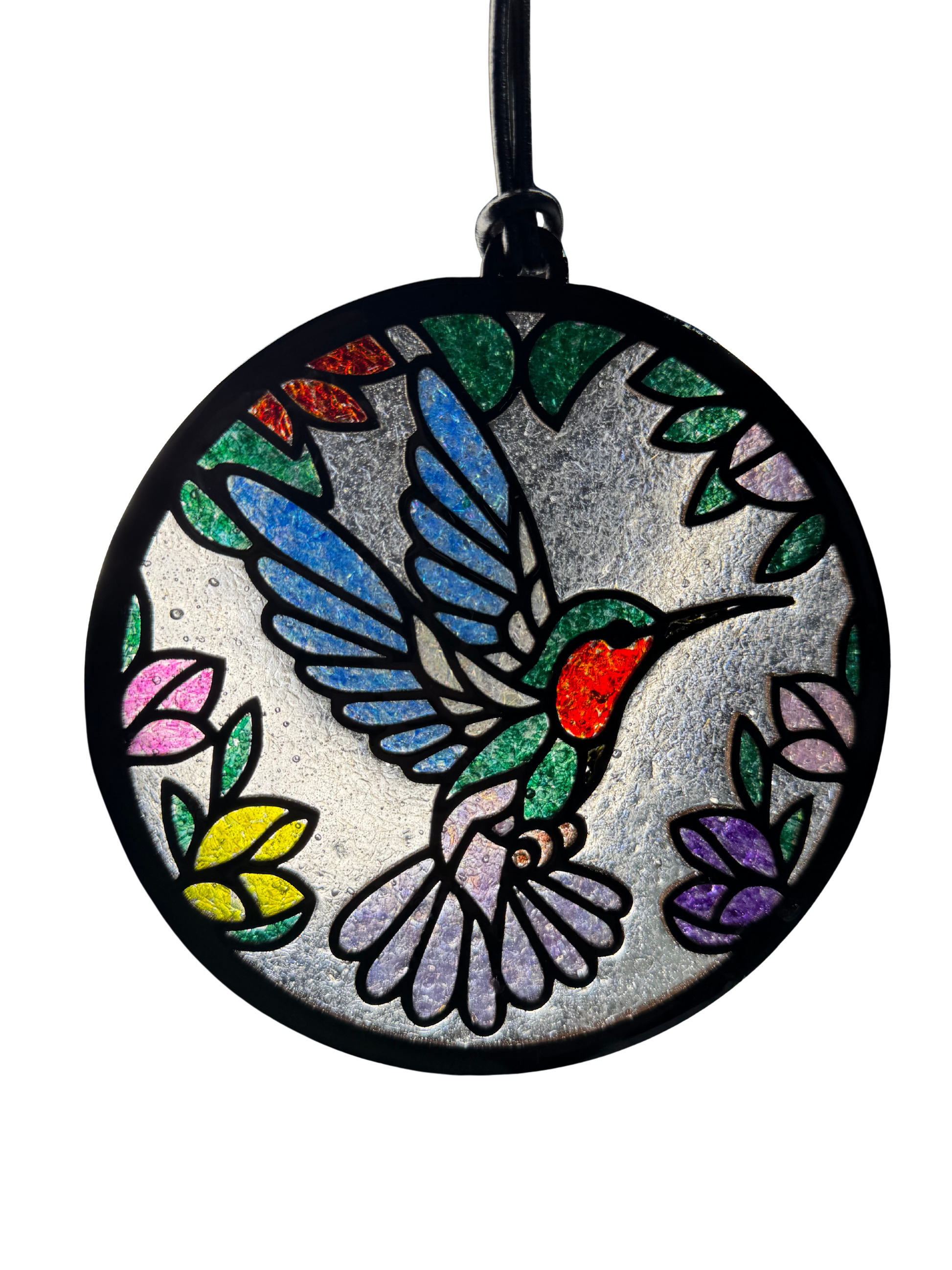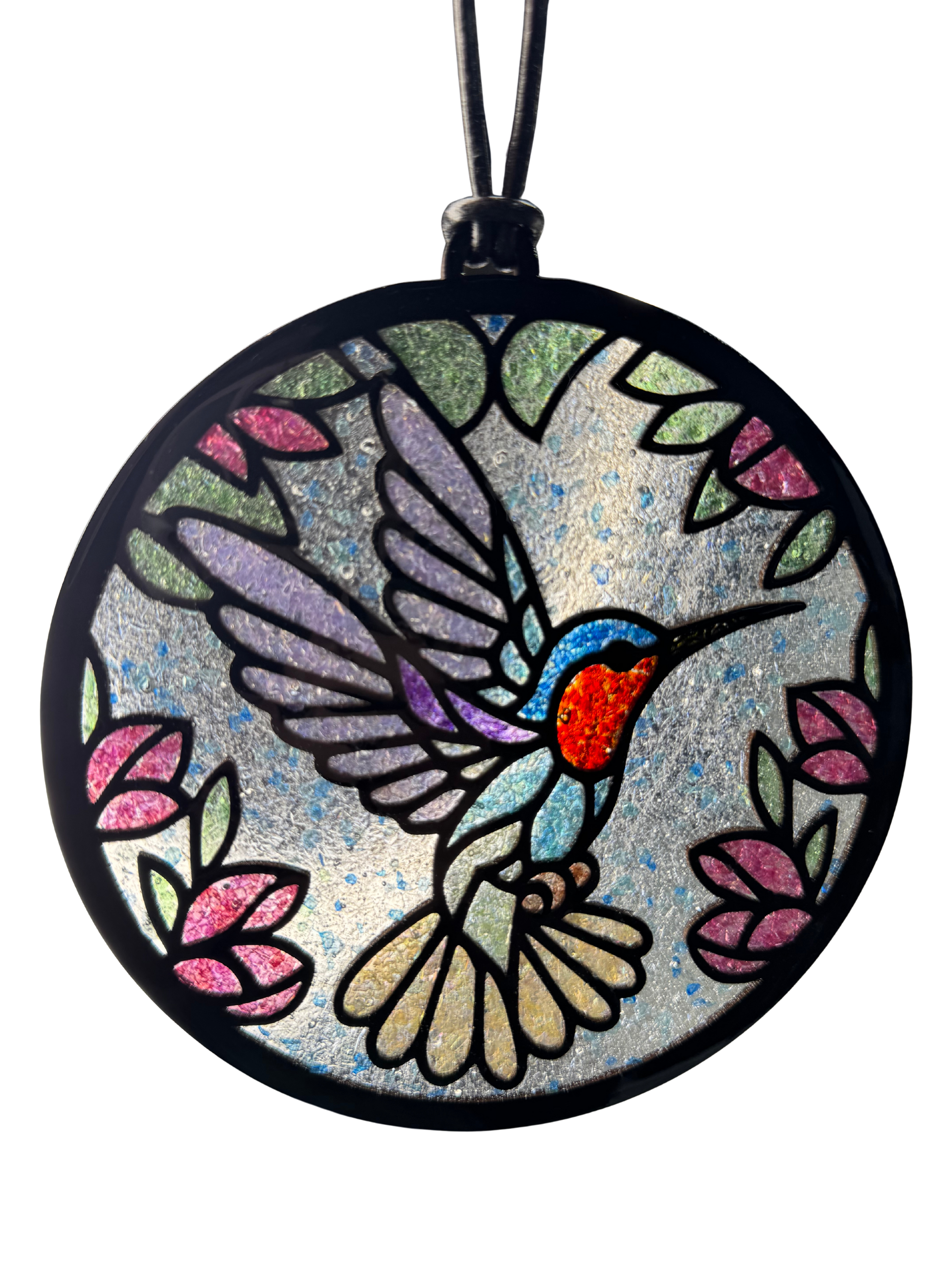 This 6" laser-cut wood outline frame captures light beautifully with crushed glass suspended in crystal-clear epoxy resin. The "Humming Along" design creates dynamic visual interest as natural or artificial light passes through, casting colorful reflections throughout your space. Includes genuine leather cord for hanging and a suction cup for flexible display options. Perfect for windows, shelves, or any area where light can enhance its artistry. A sophisticated accent piece that combines craftsmanship with contemporary design.